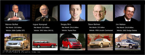 亿万富翁Warren Buffett,2007年福布斯杂志上世界上第二富的人,他刚刚把自己的座驾由一辆6年前生产的林肯Town换成了2006款的凯迪拉克DTS。这些都是传统的美式豪华车。不过这些车的价钱恐怕只是劳斯莱斯或是宾利的一个零头儿。理财专家和《百万富翁的想法》的作者Tom Stanley说:“试想一下,一位60到70岁的老人开个法拉利或是兰博基尼现实吗?”