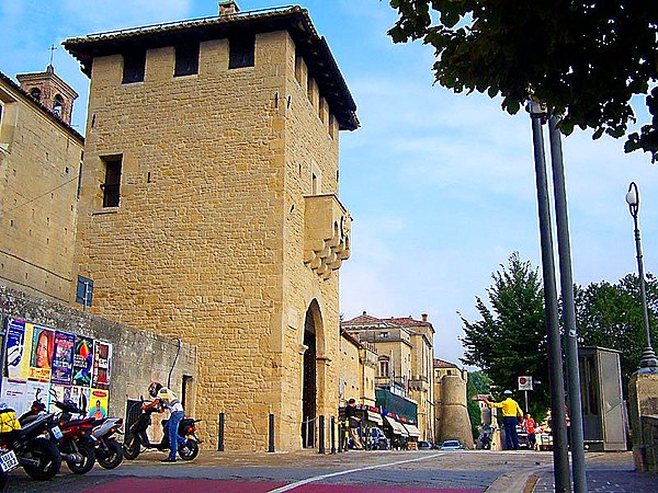 门口一位女警察,进入一个城门,就算走入一个国家了。整座圣马力诺城是一件完整的文物,也是令旅游者们目眩神迷的一块胜地。圣马力诺城虽然很小,街区间却一连有好几个广场,每个广场大体上都以一座教堂为主体建筑。穿过蒂塔诺广场,来到自由广场,又弯到加里波第广场,最后经过望楼广场。钟声在这些广场里回响时,你会感受到一种别样的趣味。爬过几条高高低低的旅游街道山路,对我们来说感觉走的太远,没想到又绕回了原地。踱出圣方济各门,迈出这个小小首都,瞭望山下,怀绕着一圈广袤的意大利田野,这时会觉得一颗心仿佛被天鹅绒包裹了起来,思绪也随之温柔而绮丽。
