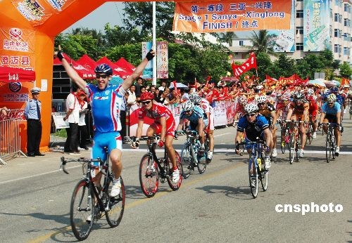 11月12日,2008环海南岛国际公路自行车赛进行第一赛段三亚至兴隆的比赛,经过163.6公里的激烈竞争,来自俄罗斯国家队的112号车手伯瑞斯·斯皮尔斯基获得赛段冠军。图为他冲过终点时庆祝胜利。