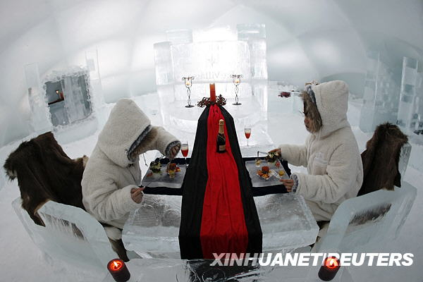 2月3日,在日本北海道的占冠一所冰旅馆内举行的媒体展上,两名女子正在享用晚餐