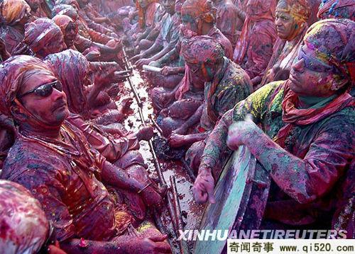 3月6日,在印度北方邦一个小镇举行的庆祝洒红节的活动中,人们互撒颜料以示祝福。