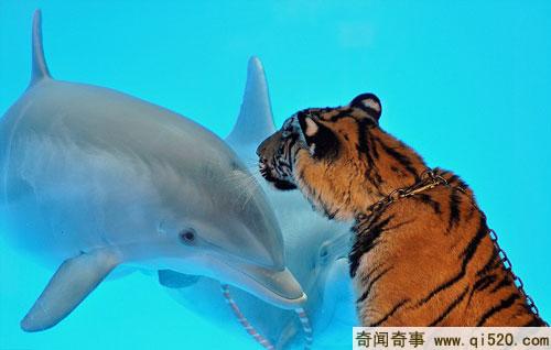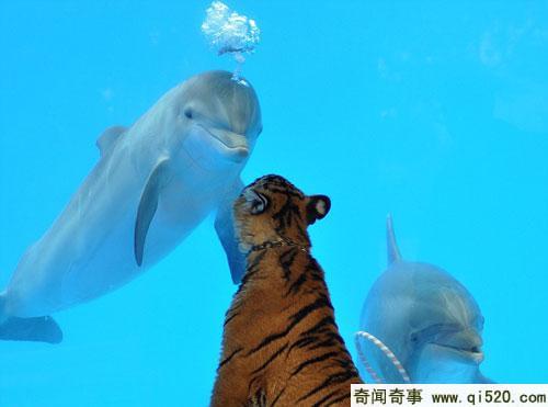 据英国《每日邮报》报道,在美国加州动物园,一只老虎和一头海豚最近成为了朋友。在玻璃池中的海豚,以吐泡泡的方式向老虎“打招呼”。
