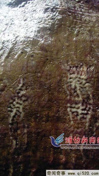 刘先生认为,这只甲鱼的罕见之处不是它体型庞大,而是它的背部有很明显的字迹。在他的提示下,记者注意到,甲鱼背部中央有两个字,像是老写的“万”字和“寿”字(见小图),背部顶端还有一个像是老写的“华”字。这些字迹是背壳的皱纹还是刻上去的呢?记者不得而知,但用手触摸后能明显感到有凸凹感。